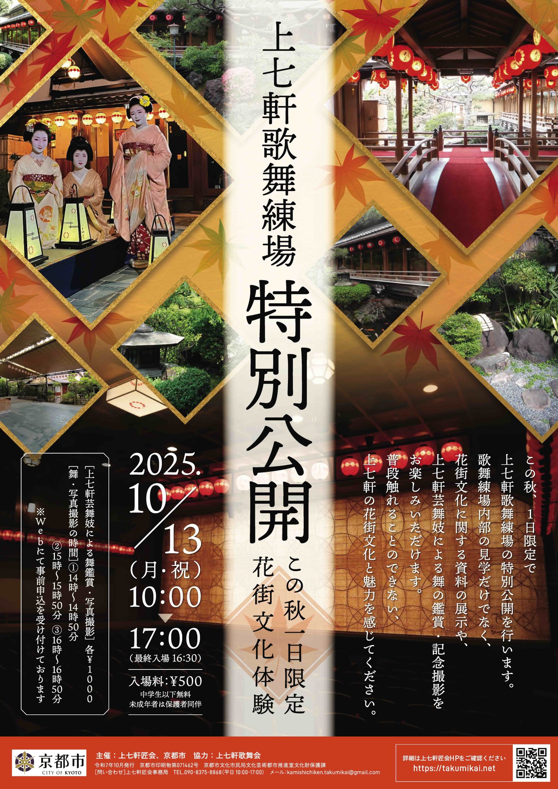 匠会では今年も上七軒落語会を5月に開催します。 そして今回がファイナル公演となります。 これまで長きに渡り、南光さん、米團寺さん、吉弥さんの落語と上七軒芸舞妓による舞という特別なプログラムを多くの皆様にお楽しみいただきました。 最後の公演もぜひ足をお運びください。 チケットは現在チケットぴあのサイトにて販売しております。 https://t.pia.jp/pia/ticketInformation.do?eventCd=2607103&rlsCd=001 セブンイレブンでもお買い求めいただけます。 pコード.540-664 ——————— 第14回 上七軒落語会 南光米團治吉弥三人会 ・日時 2026年5月9日(土)14:00開演(13:30開場) ・会場 上七軒歌舞練場 (京都市上京区今出川通七本松西入真盛町742) ・出演 桂南光、桂米團寺、桂吉弥 弥っこ 上七軒芸舞妓 ・料金 7,000円(全席指定•税込)